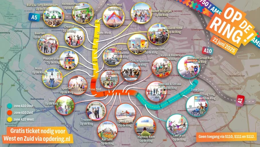 During Festival Op de Ring, there are around 25 programme segments spread across three zones on and around the motorway: A10 West, A10 Zuid, and A10 Oost.