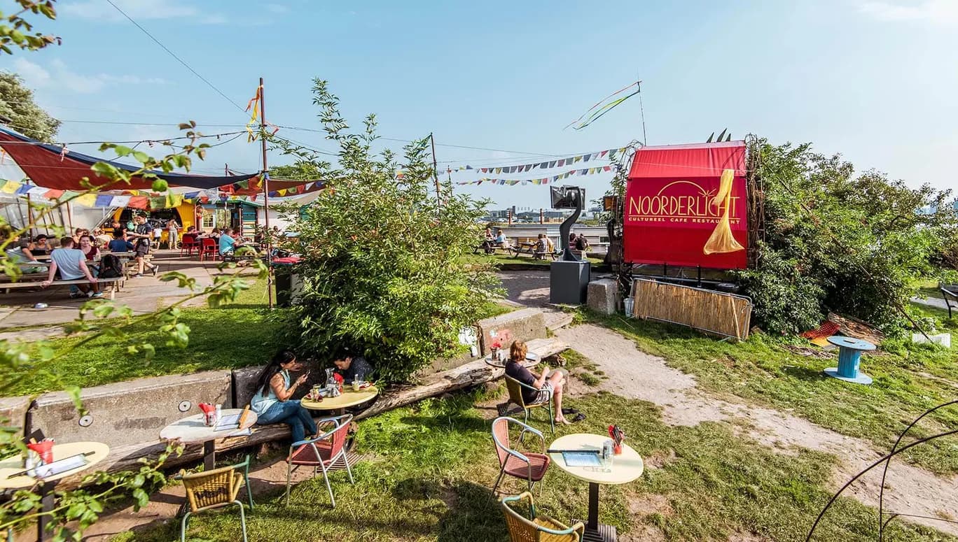Aan 't IJ staat een grote glazen koepel: het Noorderlicht Café. Bij Noorderlicht staat duurzaamheid hoog in het vaandel, dat zie je terug op de kaart en aan de gerecyclede materialen. Voor de glazen koepel ligt een ruim grasveld met een heerlijk terras aan het water. Noorderlicht organiseert ook veel livemuziek en andere creatieve evenementen.