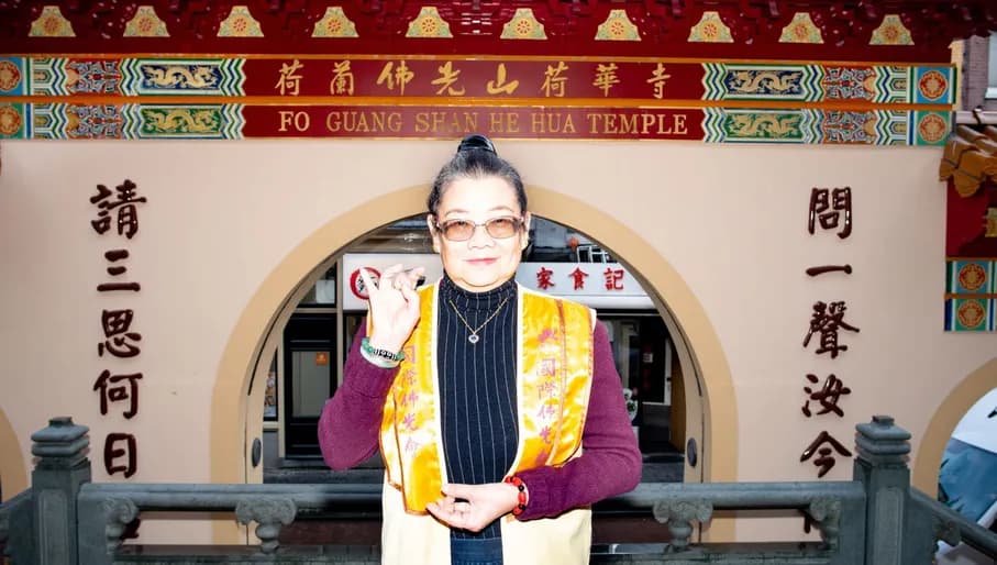 Kim Hollauf Teh (73) is gepensioneerd restauranteigenaar en boeddhist. ‘Het boeddhisme is voor mij een manier van leven. Eigenlijk is het een vrij gemakkelijke religie. Je kunt zelf uitmaken hoe welke plek het in je leven heeft. Sinds ik met pensioen ben, zet ik mij in om de Boeddhistische wijsheden door te geven aan de nieuwe generatie. Dat doe ik in de Fo Guang Shan He Hua Tempel aan de Zeedijk waar ik in 2006 ben gekomen. Ik geef rondleidingen aan studenten, geef informatie en leid meditaties. Mediteren is voor mij een belangrijk ritueel. Het is een manier om in vrede met jezelf, je omgeving en de wereld te leven. Elke zondag wordt er een dienst gewijd aan een van de boeddha’s. En we vieren natuurlijk alle feesten zoals de geboortedag van Boeddha. Dan versieren we de baby Boeddha en houden we reinigingsrituelen. Daarna eten we samen want ook dat is een belangrijk deel van het Boeddhisme: de samenhorigheid van de gemeenschap. Het mooie aan de Fo Guang Shan He Hua Tempel is dat iedereen binnen kan lopen. Voor mij is het ook een plek waar ik in contact ben met de Chinese cultuur. Ik vind het belangrijk om die cultuur in leven te houden.’