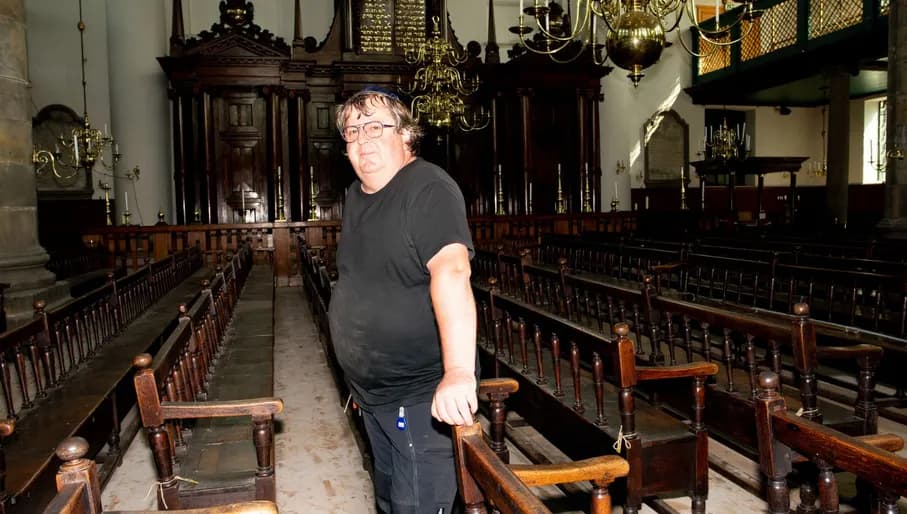 Mark Williams (59) werkt bij de technische dienst van het Joods Cultureel Kwartier (JCK) en is verantwoordelijk voor het aansteken van alle kaarsen in de Portugese synagoge. 'De Portugese synagoge heeft geen verwarming en geen elektrisch licht. Het gebouw is qua uitstraling, maar ook qua beleving, nog net zoals 350 jaar geleden. In de synagoge hangen meerdere grote kroonluchters met in totaal meer dan 600 kaarsen. Als er een dienst of een speciale ceremonie is, ben ik degene die alle kaarsen aansteekt. Ik gebruik een trap en een aansteker, en ik ben er ruim een uur mee bezig. Ook moeten de kaarsen weer uitgeblazen en regelmatig vervangen worden. Vaak geloven mensen niet dat de synagoge zo ouderwets is, maar ik zeg altijd: kom zelf kijken. De synagoge kun je bezoeken met een museumticket. Daarnaast organiseren we 6 à 7 keer per jaar een speciaal kaarslichtconcert, waar je kunt genieten van klassieke muziek of jazzmuziek terwijl alle kaarsen branden.'
