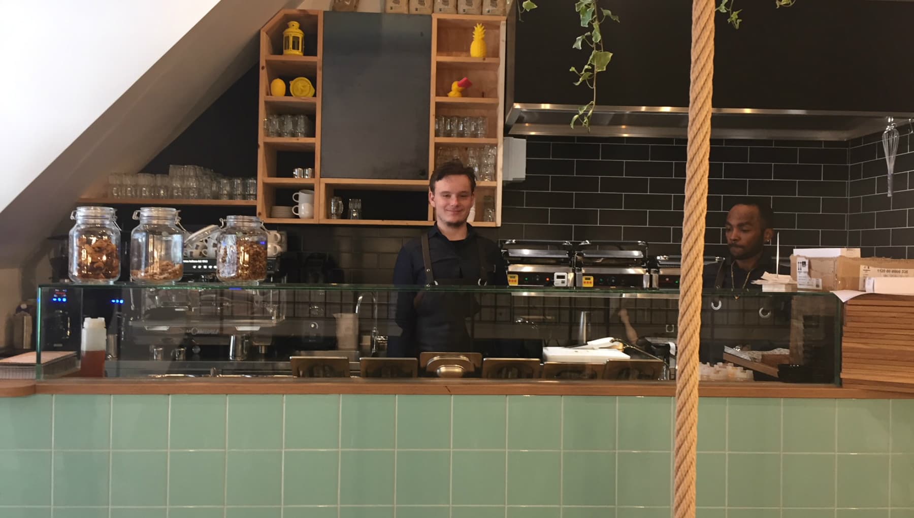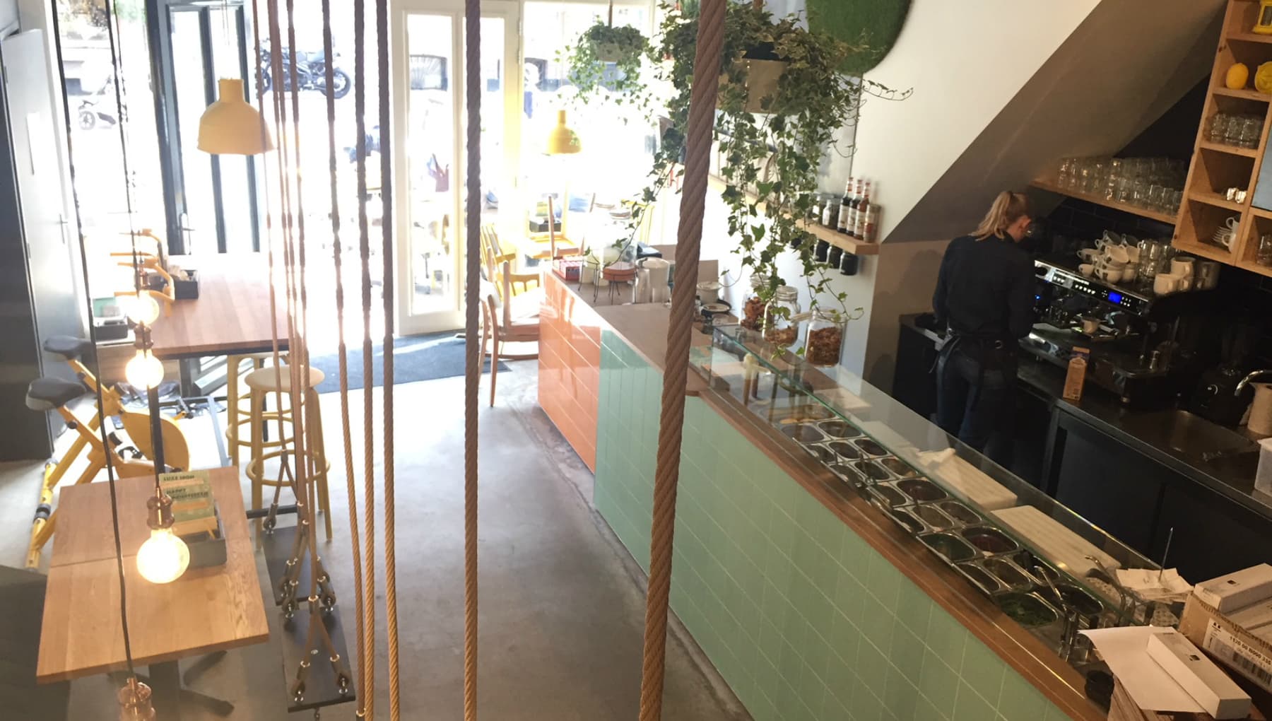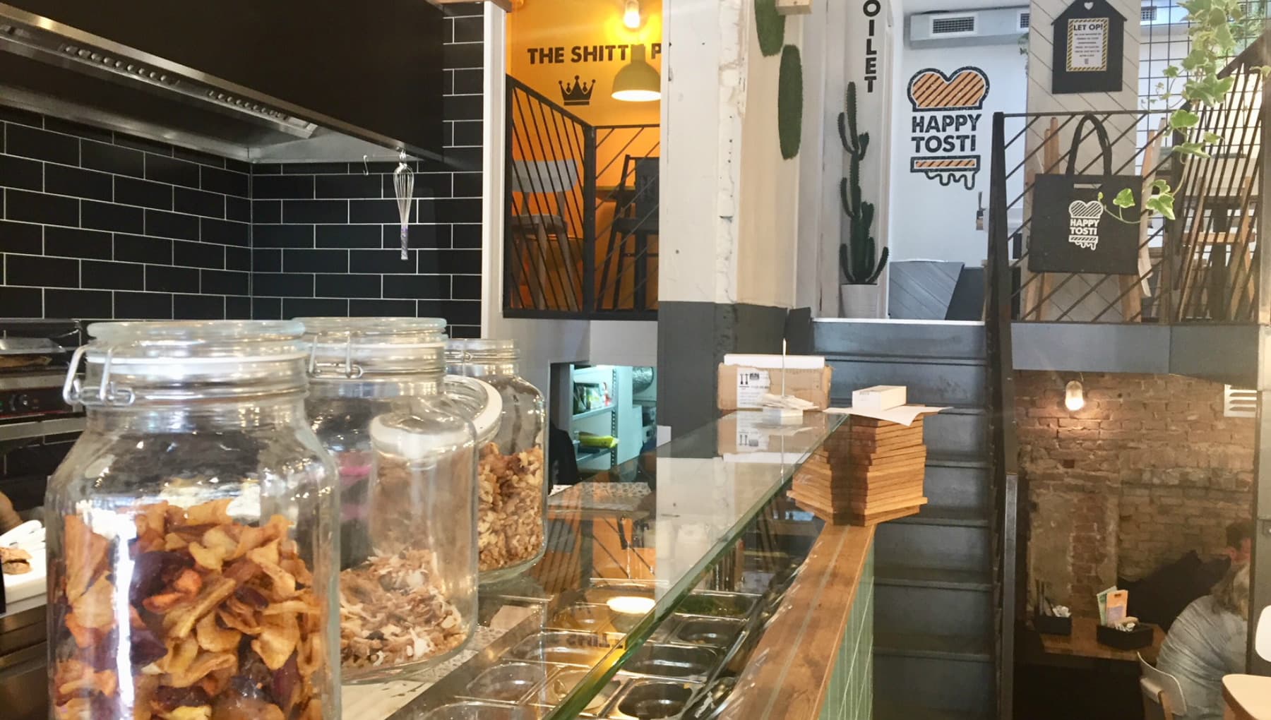 Van een lekkere tosti wordt iedereen gelukkig. Bij Happy Tosti maken ze geweldige versies, variërend van een perfect uitgevoerde klassieker met ham en kaas tot een tuna melt tosti en een zoete versie met banaan en chocola. Naast tosti’s staan er ook biologische panini, yoghurt met toppings en soepen van de Verspillingsfabriek op de kaart. Het kleurige interieur met hangplanten en een groene tegeltjesbar is extra vrolijk door de zitplaatsen in de vorm van schommels en hometrainers. Happy Tosti - inmiddels een keten met zes vestigingen - werkt met mensen met een arbeidsbeperking.