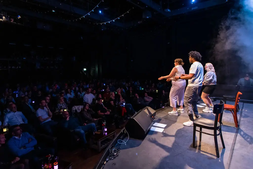 Bij Boom Chicago zitten gasten aan tafels en kunnen ze voor en tijdens de show genieten van drankjes. Na afloop kunt u samen met de cast een drankje drinken aan de bar. U zult deze toekomstige beroemdheden misschien nooit meer zo dichtbij zien!