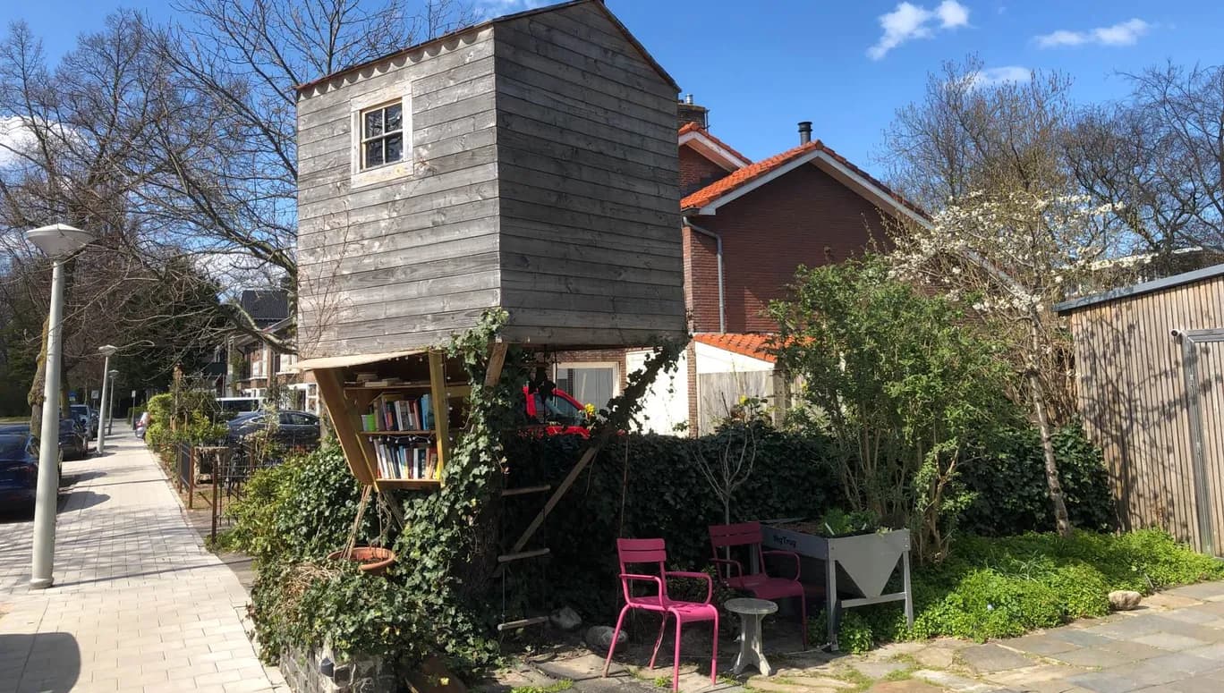 Omdat de ruilkast in deze straat ophield met bestaan, besloten de eigenaren van de boomhut de boel over te nemen. Een geslaagde actie, want de minibieb is volledig geïntegreerd in het bouwsel en het lijkt alsof hij er altijd al in heeft gezeten. Extra leuk is dat de bieb is versierd met lampjes die ’s avonds gezellig twinkelen. Je vindt er boeken voor kinderen en volwassenen en soms ligt er zelfs een verrassing in…
