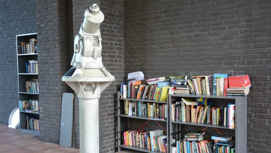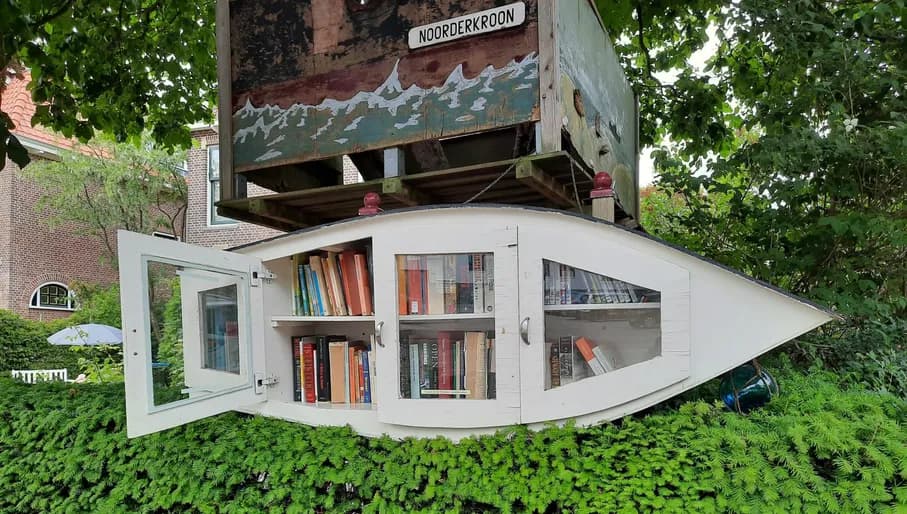 Deze prachtige minibieb in de vorm van een totempaal is opgebouwd uit allemaal verschillende voorwerpen. Zo zie je bijvoorbeeld onderdelen van speakers, een schommel, een kinderbedje en nog veel meer. Naast alle mooie versieringen houdt een grote ridder de wacht. Deze minibieb in Noord is in 2020 ontstaan en blijft sindsdien groeien. De vriendelijke eigenaren hebben nog genoeg boeken en ideeën op voorraad om hier voorlopig mee door te gaan. Dit kunstwerk is het bezoeken meer dan waard!