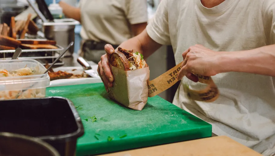 Alles wat bij Fort Negen op het broodje terechtkomt, van de pastrami tot de pickles en de mosterd, wordt in house gemaakt. Net als het brood natuurlijk, dat soms ook speciaal voor een sandwich ontwikkeld wordt. Dat zelfgemaakte is wat eigenaar Maarten Langeslag zelf zoekt als hij ergens een broodje koopt. ‘Een broodje hagelslag kan ik thuis ook maken, maar als ik zelf vlees moet pekelen en roken, en groenten in moet leggen, ben ik echt wel lang bezig met m’n lunch. Een gespecialiseerde plek waar je dat zo kan eten, vind ik heel gaaf.’ De broodjes hier gaan regelmatig viral, zoals het inmiddels welbekende broodje kaassoufflé. ‘Misschien hebben we geluk dat we in West zitten, en dat daardoor iedereen uit de buurt hier komt – het is best ver uit het centrum. Uiteindelijk zijn we gewoon een buurtbakker.’