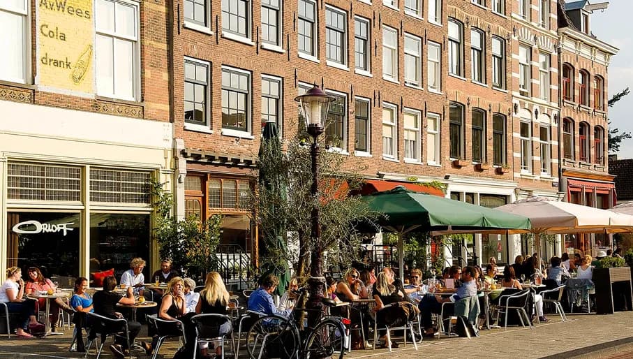 Het terras van café Orloff is ruim, wat verschillende voordelen heeft. Zo heb je niet alleen meer kans op een plekje, bij mooi weer kun je ook lang van het zonnetje genieten. Win-win. Maar ook als de zon niet schijnt, kijk je hier mooi uit op de sluispoort van het Entrepotdok en op de Schippersgracht.