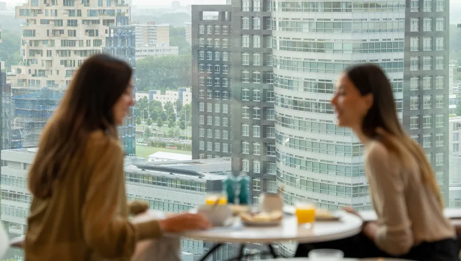 Op de 5e verdieping van B.Amsterdam geniet je van een prachtig uitzicht over Nieuw-West. Daarnaast heb je met een lidmaatschap ook toegang tot co-working plekken, sport- en sociale faciliteiten en verschillende netwerken.